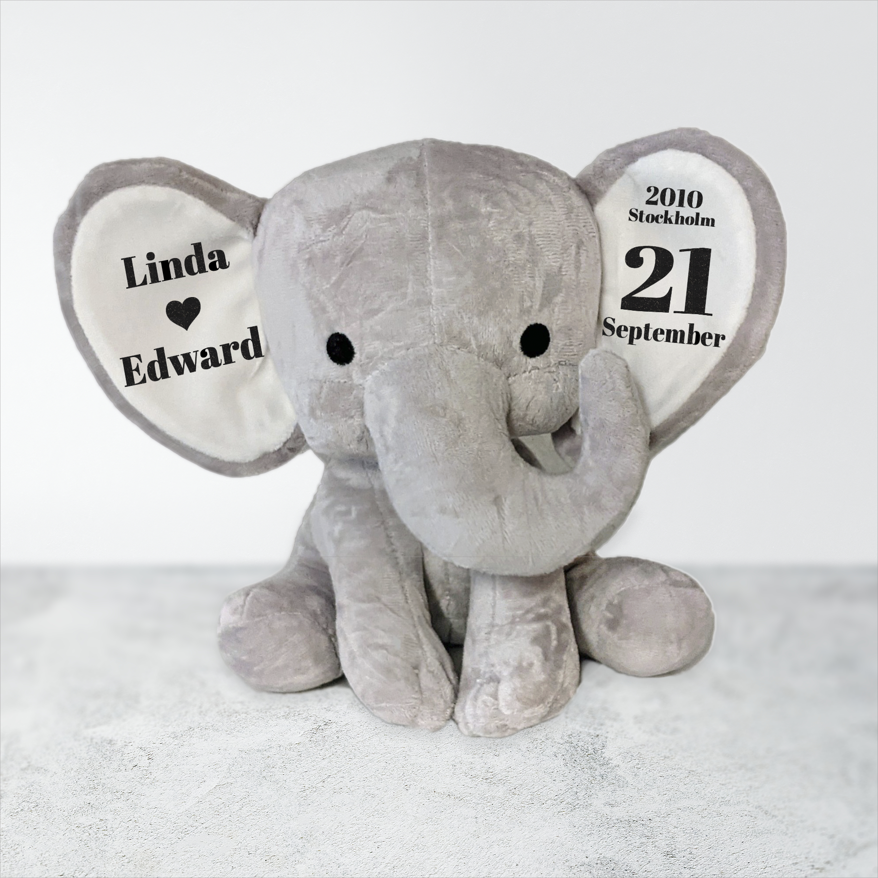 Detta mjuka elefantgosedjur är en omtänksam och personlig present, både till nyfödda och som en minnesvärd gåva till din partner. Med möjlighet att lägga till valfri text elelr namn på öronen blir varje gosedjur unikt och fyllt med känsla , en perfekt dopgåva, nyföddspresent eller som en kärleksfull överraskning till din partner.