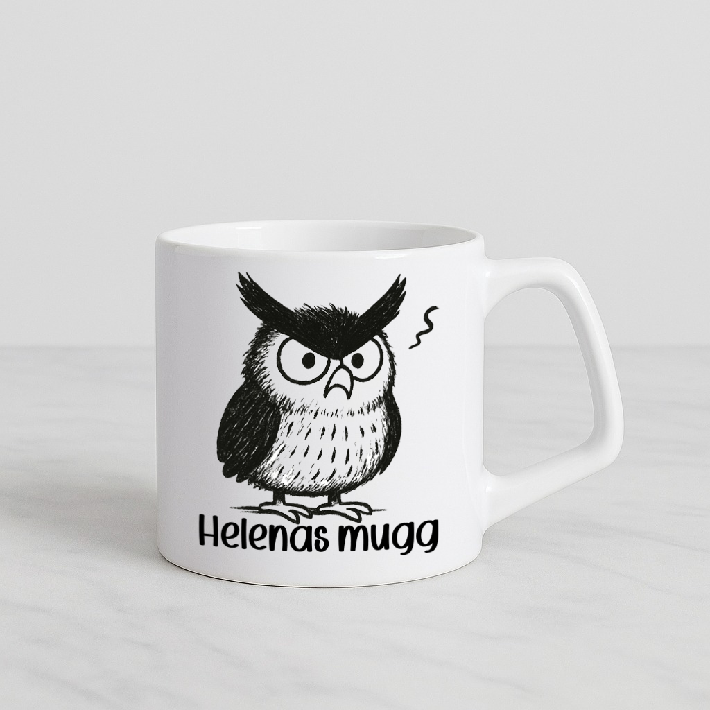 En personlig mugg med arg uggla där du kan lägga till eget namn eller text. Perfekt som kaffemugg eller temugg. Med denna design vågar ingen röra din mugg och den lockar garanterat till skratt.